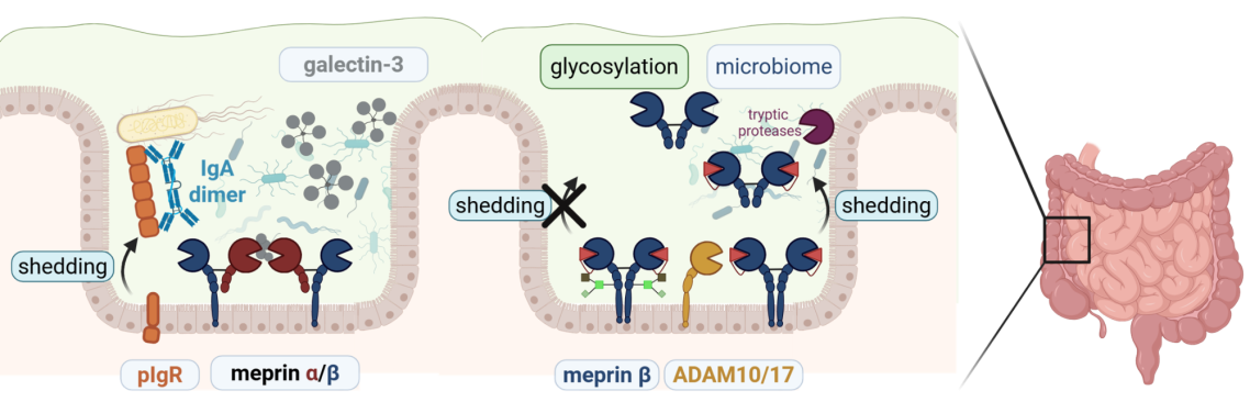 With the help of mass spectrometry based proteomics approaches, we revealed proteolytic events that regulate the composition of the intestinal microbiome. Importantly, the microbiome itself has great impact on the activity and localization of meprin metalloproteases thereby influencing their immunemodulatory functions.