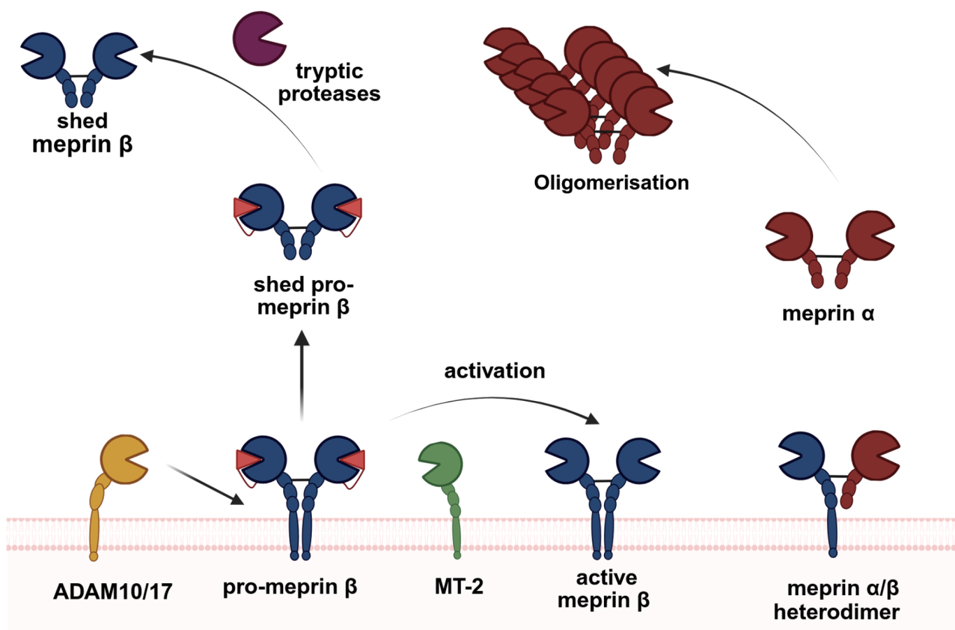 Our group is particularly interested in meprin and ADAM metalloproteases and their regulation at the plasma membrane. We identified unique molecular features that impact activity and localization of these enzymes and have consequences for the biological function.